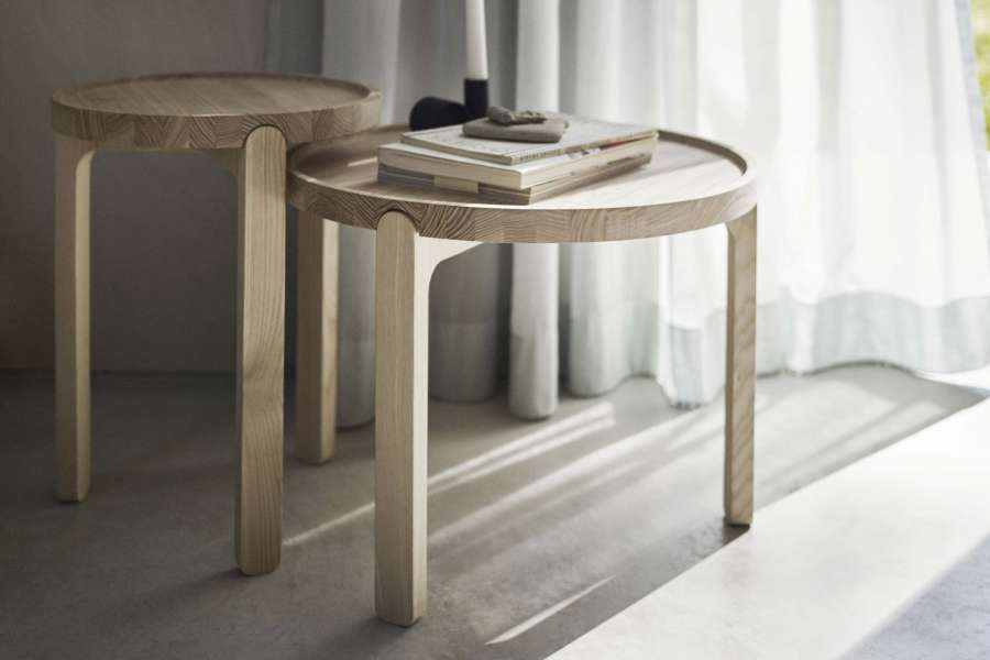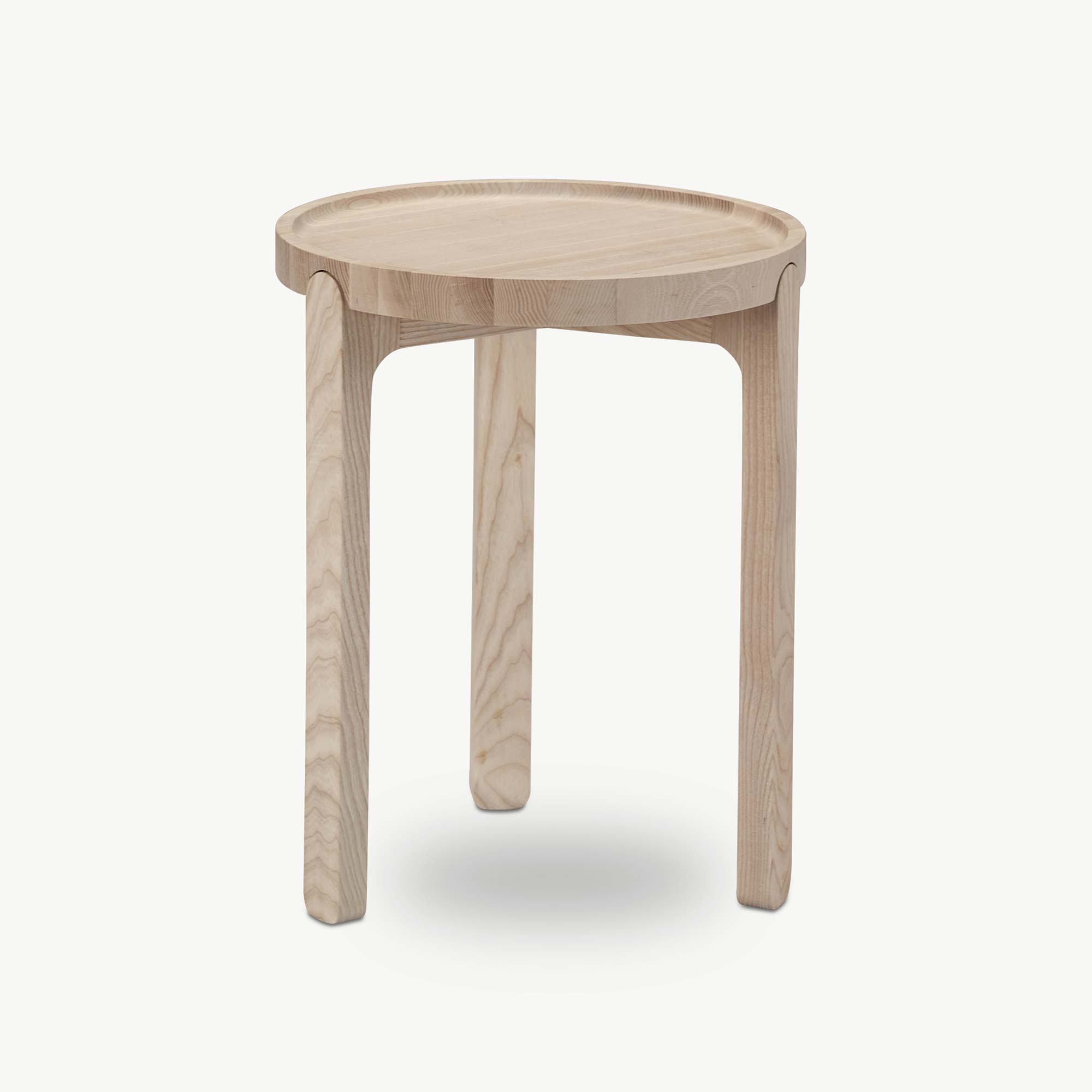 Auch das Material, unbehandelte Esche, zieht mit ihrer lebendigen Maserung die Blicke auf sich und stehen für Langlebigkeit und Beständigkeit. Ein Gestell aus drei Beinen trägt die runde Tischplatte, die gleichermaßen als Tablett genutzt werden kann. Aus der Küche mit Gläsern oder Snacks beladen, bedarf es lediglich eines Handgriffs, um die Tischplatte in die Halterung zu setzen. Dabei fügen sich die drei Tischbeine in die davor vorgesehenen Einkerbungen am Tablettrand ein und sorgen für die nötige Stabilität. Die leicht erhöhte Außenkante bewahrt Gegenstände vor einem eventuellen Fall.