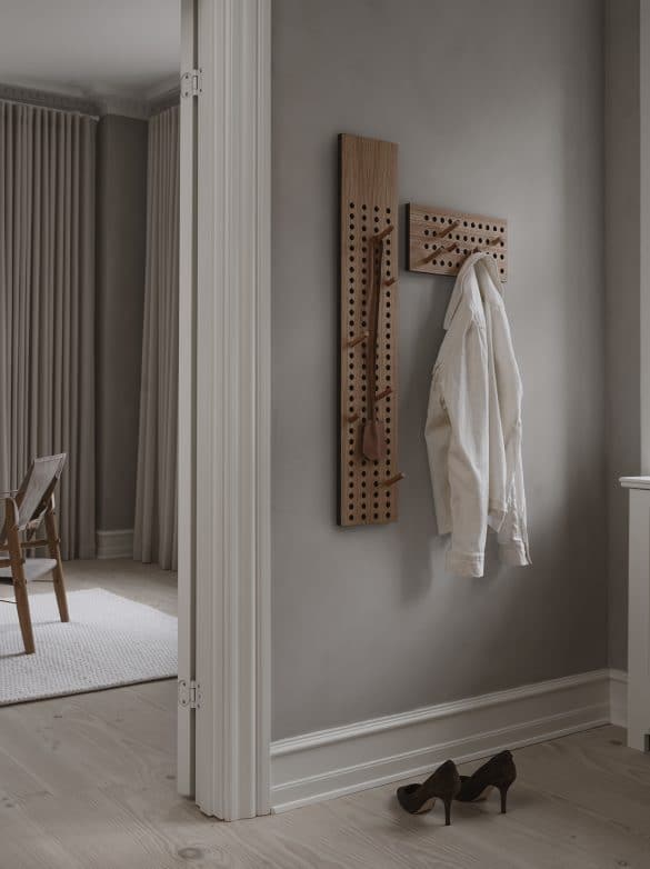 Kaum ein Möbelstück hält so viele individuelle Nutzungs- und Kombinationsmöglichkeiten bereit wie die Garderobe SCOREBOARD des dänischen Designer Sebastian Jorgensen. Während sich die horizontale Variante besonders gut für längere Jacken, Mäntel und Schals eignet, finden an den vertikalen Garderoben kleinere Accessoires wie Mützen und Taschen ihren Platz. Je nach benötigtem Platzangebot nehmt ihr die Haken aus Holz ab und steckt sie um. Das ist besonders dann nützlich, wenn ihr Gäste erwartet.
