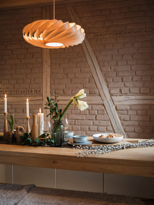 Ebenso wichtig wie Kerzen, ist eine indirekte Beleuchtung, die zu jeder Tageszeit Atmosphäre schafft. Dänen wissen längst, wie sich das richtige Licht auf die Stimmung auswirkt. Dabei setzt der dänische Designer Tom Rossau auf zartes Holzfurnier, welches die Lichtquelle stilvoll umschließt und den Raum so mit Wärme füllt.