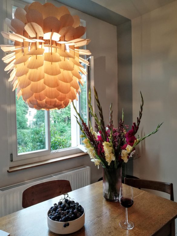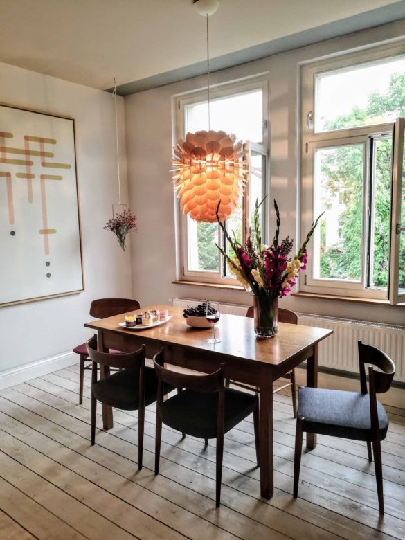 Neu umgestylt wurde der Essbereich, mit wunderschöner Esstisch-Deko in Rosétönen. Die ZAPPY Leuchte macht in der Nachmittagssonne und auch bei der abendlichen Party einfach richtig Stimmung. Ganz fabelhaft, wenn die Sonne durch die Holzlamellen des „Zapfens“ scheint, und später die Glühbirne.