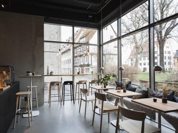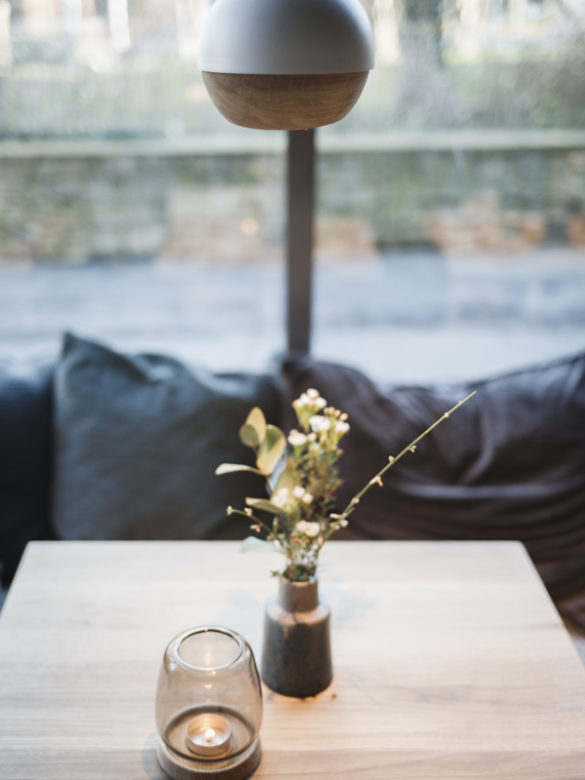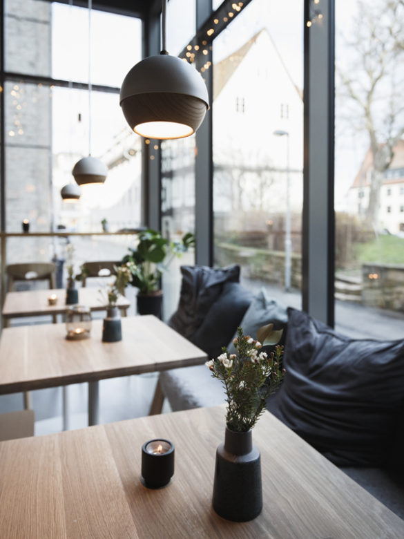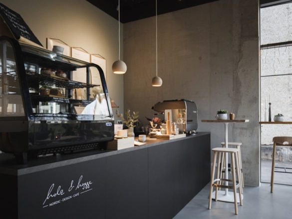 Für eine besonders stimmungsvolle Atmosphäre sorgt unter anderem die Leuchtenwand mit Design Lampen von Tom Rossau, Tom Raffield und dreizehngrad. So ist mit „Holz & Hygge“ ein Ort der Entschleunigung und des Genusses entstanden, mit urbanem Feeling. Und wie uns ein dänischer Gast sagte „Der Latte schmeckt nach Kopenhagen“. Das ist für uns das größte Lob.