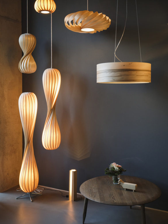 Für eine besonders stimmungsvolle Atmosphäre sorgt unter anderem die Leuchtenwand mit Design Lampen von Tom Rossau, Tom Raffield und dreizehngrad.