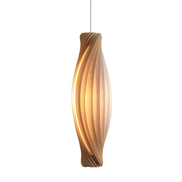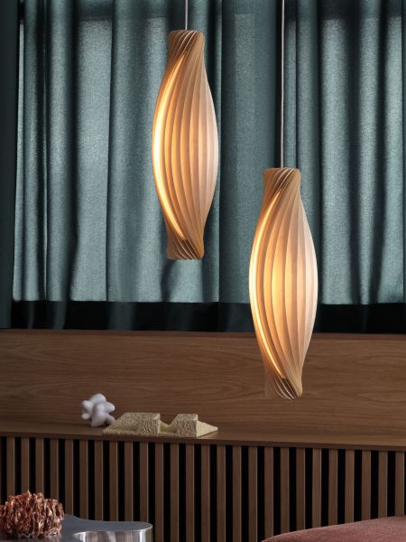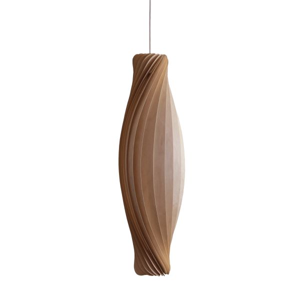 Nachhaltig gestaltete Design Hängeleuchte aus einzelnen Birkenholzlamellen als stimmungsvolle Lichtquelle und ausgefallenes Designobjekt
