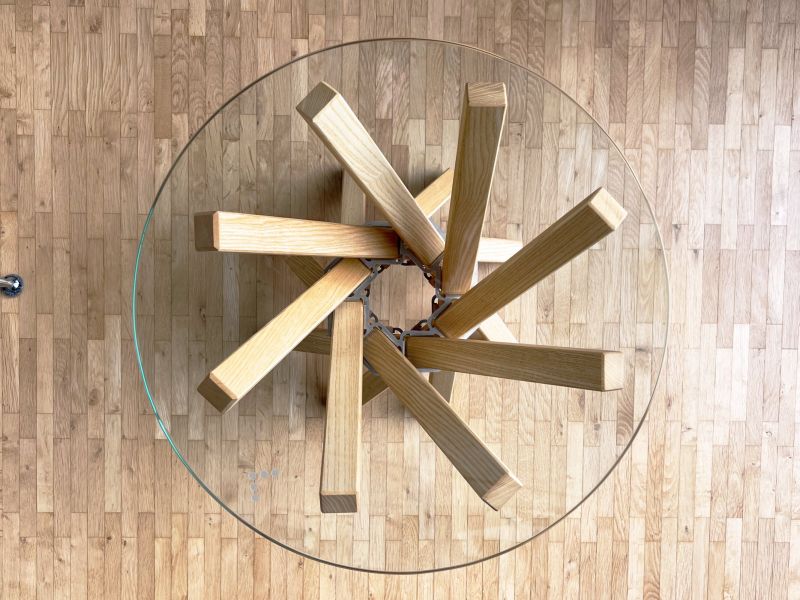 Acht Stäbe aus Eichen- oder Eschenholz tragen die runde Tischplatte aus Sicherheitsglas mit polierter Kante