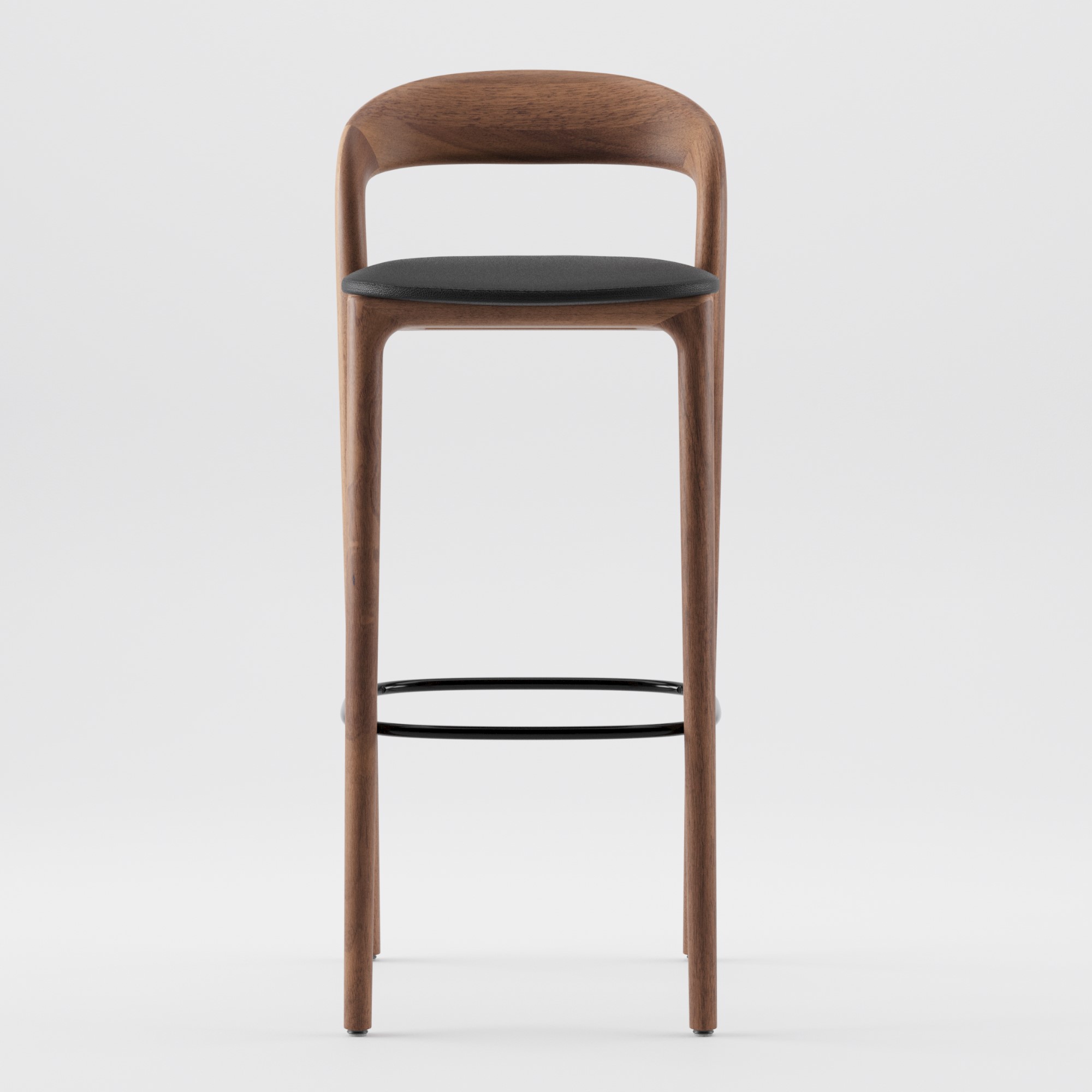 Vorderansicht des modernen Massivholz Barhockers NEVA LIGHT 65 BAR CHAIR von Artisan aus Nussbaum mit Rückenlehne und gepolstertem Ledersitz