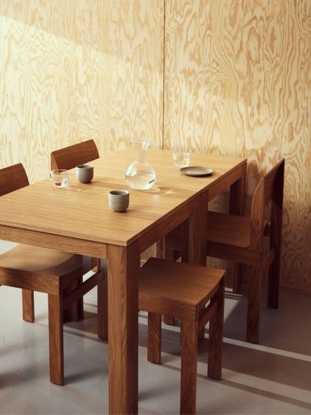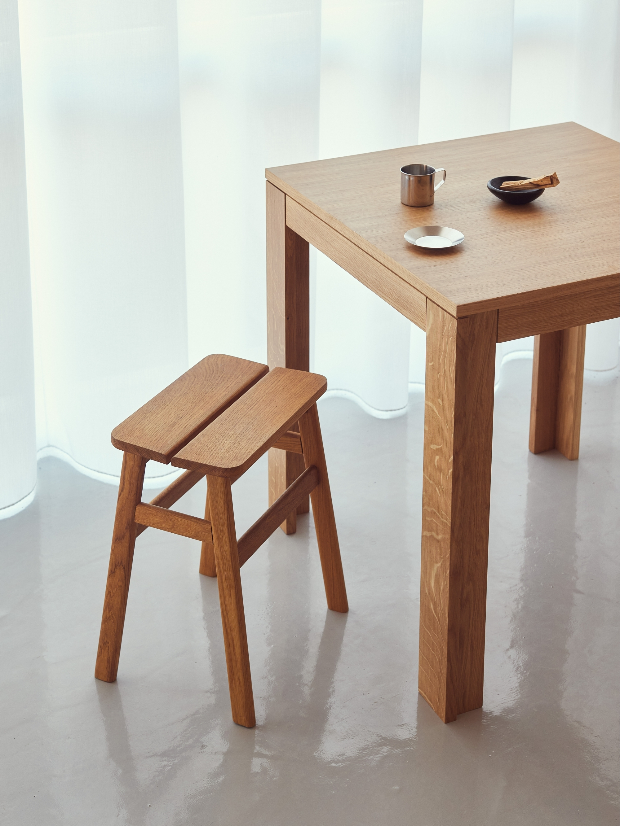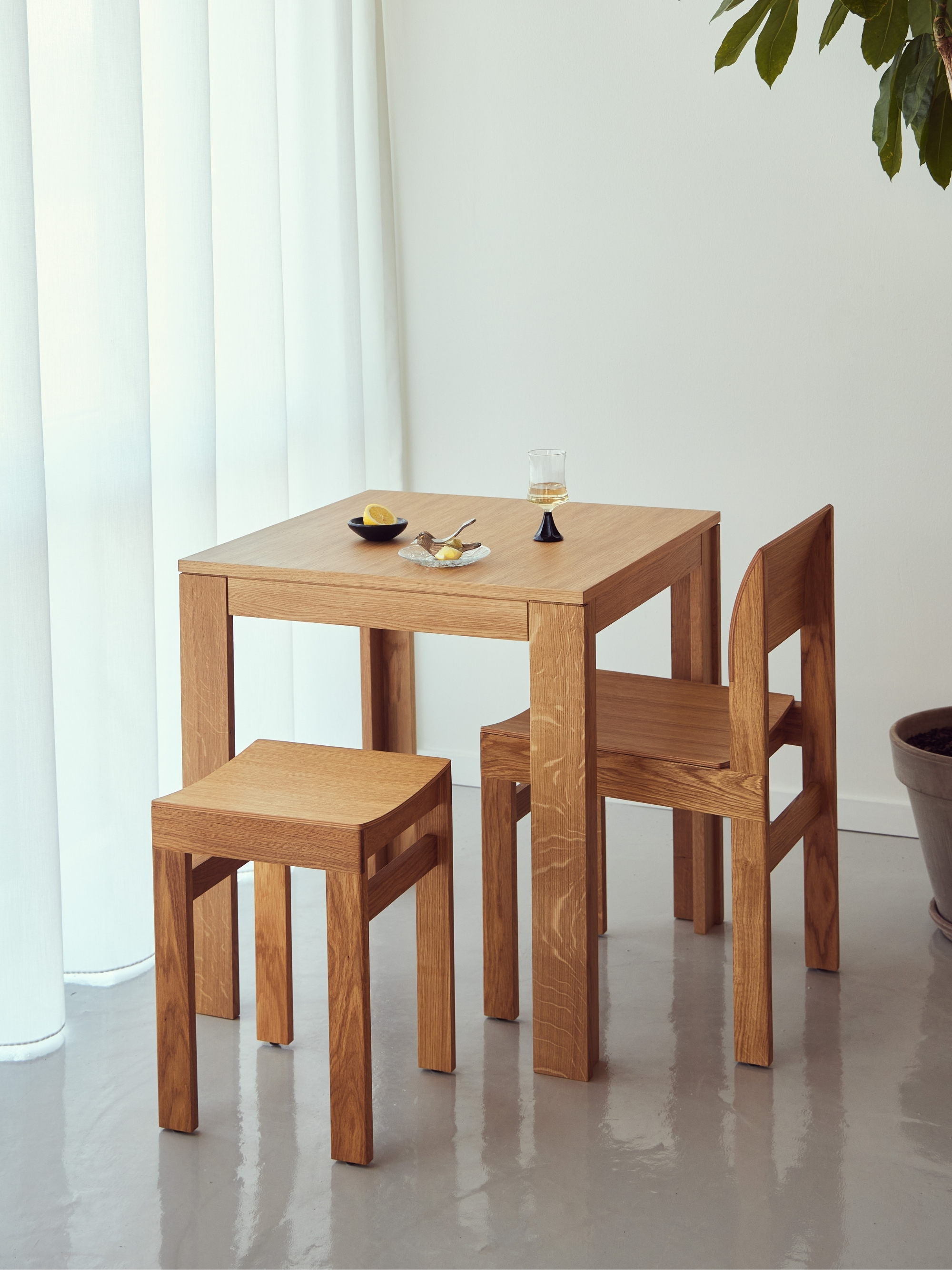 Das Gestell des ELEMENT TABLE wird aus FSC-zertifizierter massiver europäischer Eiche gefertigt und sorgt für Stabilität und Langlebigkeit. Die Tischplatte besteht aus Eichenfurnier, das eine ruhige, gleichmäßige Oberfläche bietet und gleichzeitig den sparsamen Umgang mit Ressourcen unterstützt. Wie der Designer selbst sagt, war es sein Ziel, einen Tisch mit einer brutalistischen Anmutung und entsprechender konstruktiver Stärke zu entwerfen. Feine, bewusst gesetzte Details an den Übergängen der einzelnen Elemente lassen die Konstruktion visuell klar gegliedert erscheinen und verleihen dem Tisch seine charakteristische Präsenz. So verbindet der quadratische Holztisch handwerkliche Präzision, nachhaltige Materialwahl und eine klare gestalterische Haltung.