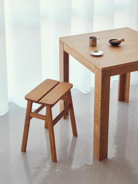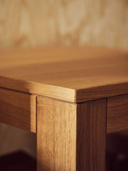 Die Oberfläche des Holztisches ELEMENT TABLE von FORM & REFINE ist matt lackiert, was nicht nur zum Schutz beiträgt, sondern auch die lebendige Maserung des Eichenholzes hervorhebt ABMESSUNGEN