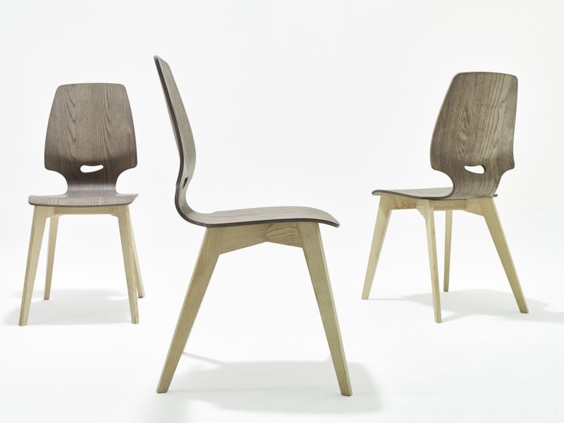 Holzstuhl FINN von sixay mit ergonomischem Sitz in der Frontal- und Seitenansicht