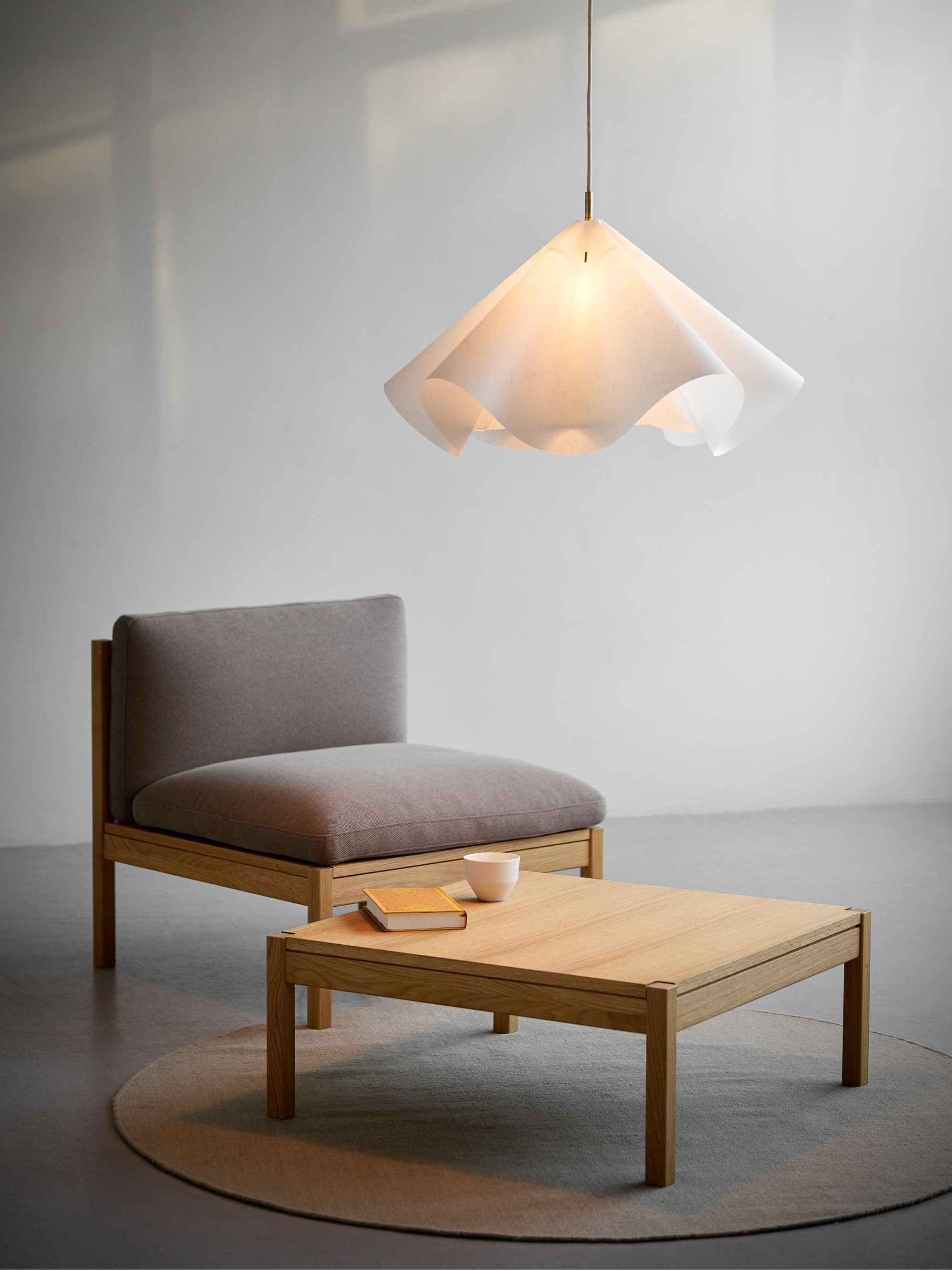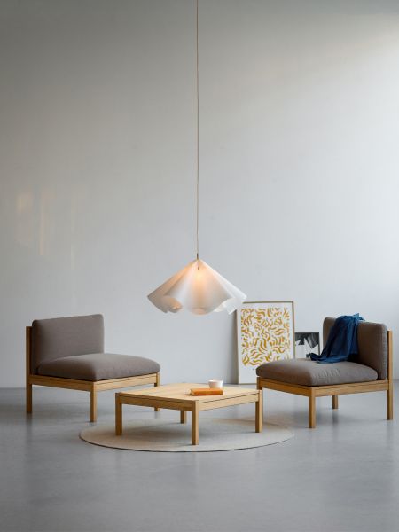 Einladendes Wohn-Setting mit der Hängeleuchte SINUATE PENDANT aus Papier von MOEBE