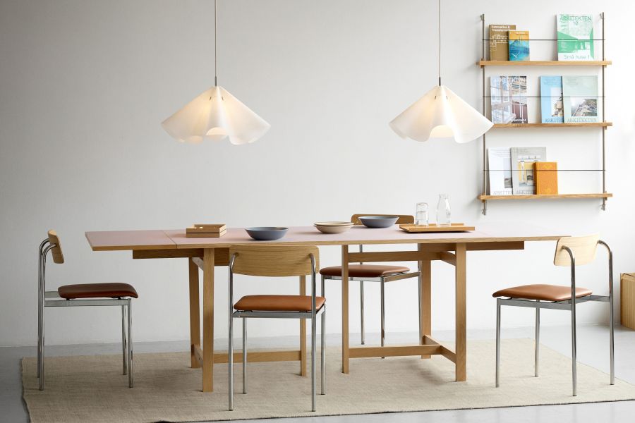 Modernes Esstisch-Setting mit der Hängeleuchte SINUATE PENDANT aus Papier von MOEBE