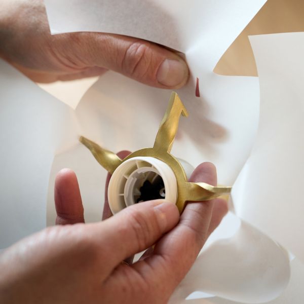Die Halterung aus edlem Messing oder gebürstetem Edelstahl setzt dabei einen feinen, metallischen Akzent zur natürlichen Weichheit des Papiers und unterstreicht den hohen Qualitätsanspruch von MOEBE.