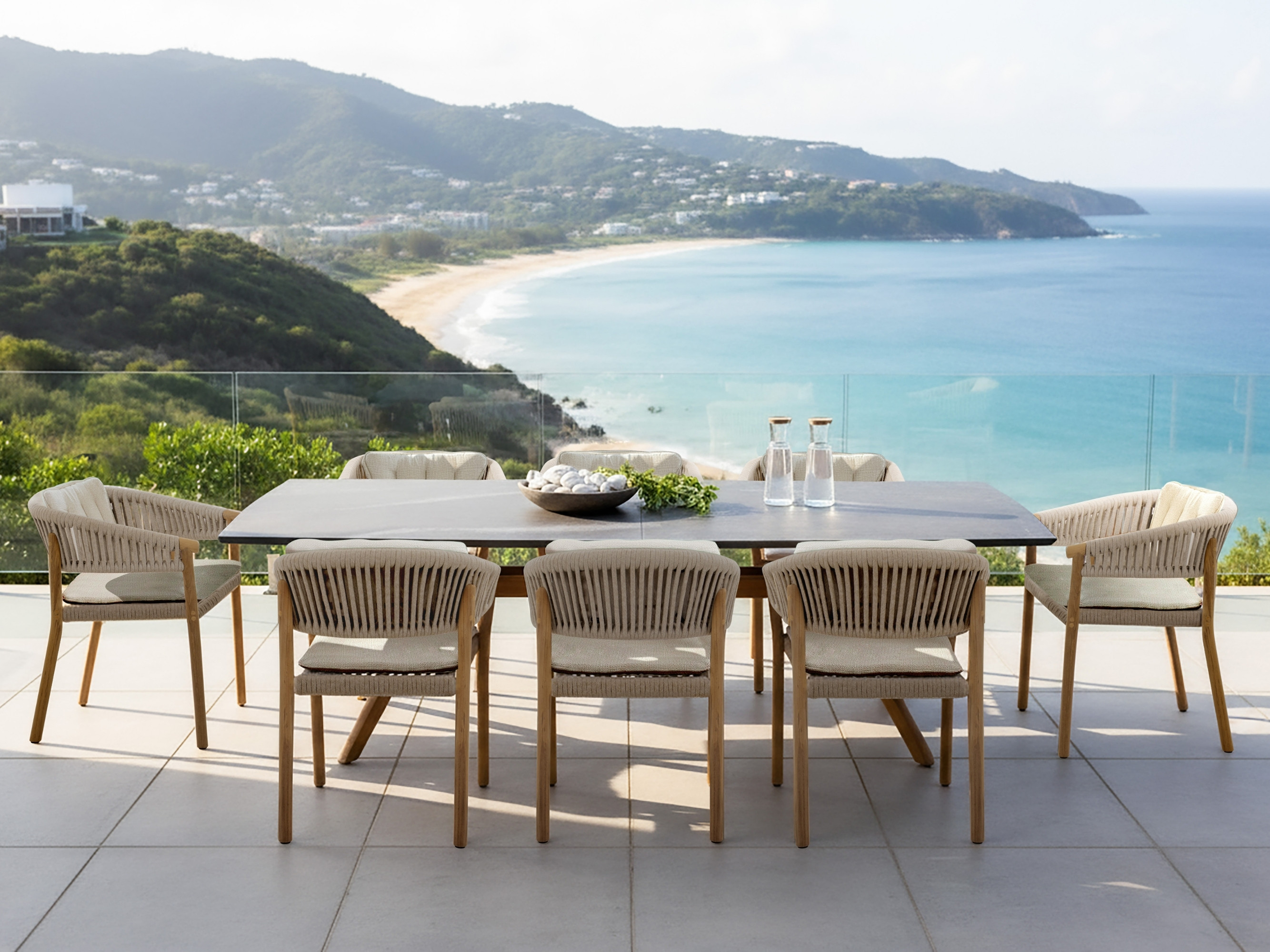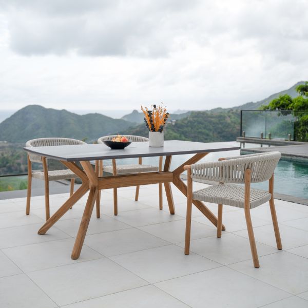 Einladendes Outdoor-Setting mit dem Gartenstuhl MARCELLA DINING CHAIR aus Teak mit Geflecht und dem Tisch NEO von Traditional Teak