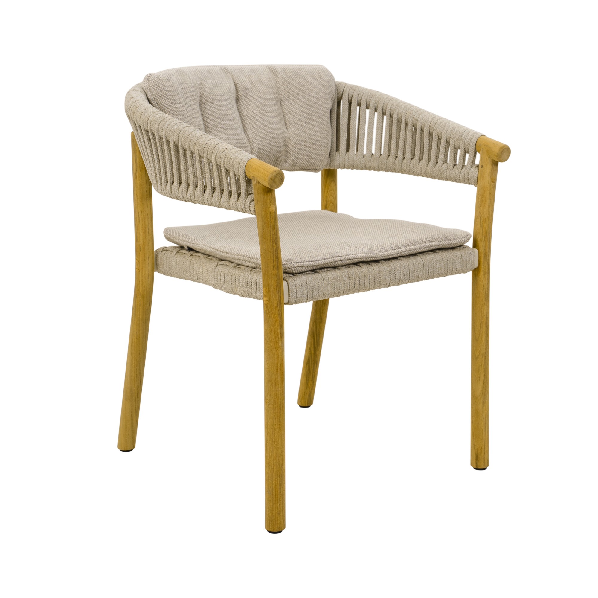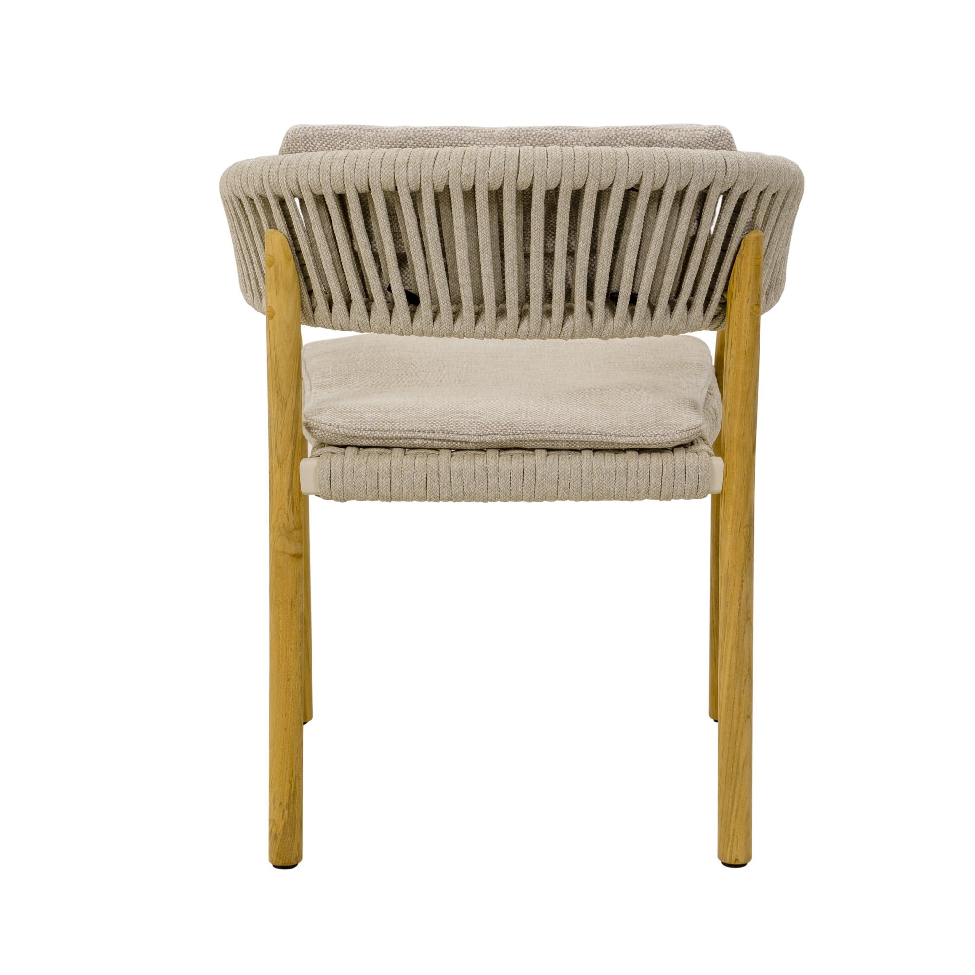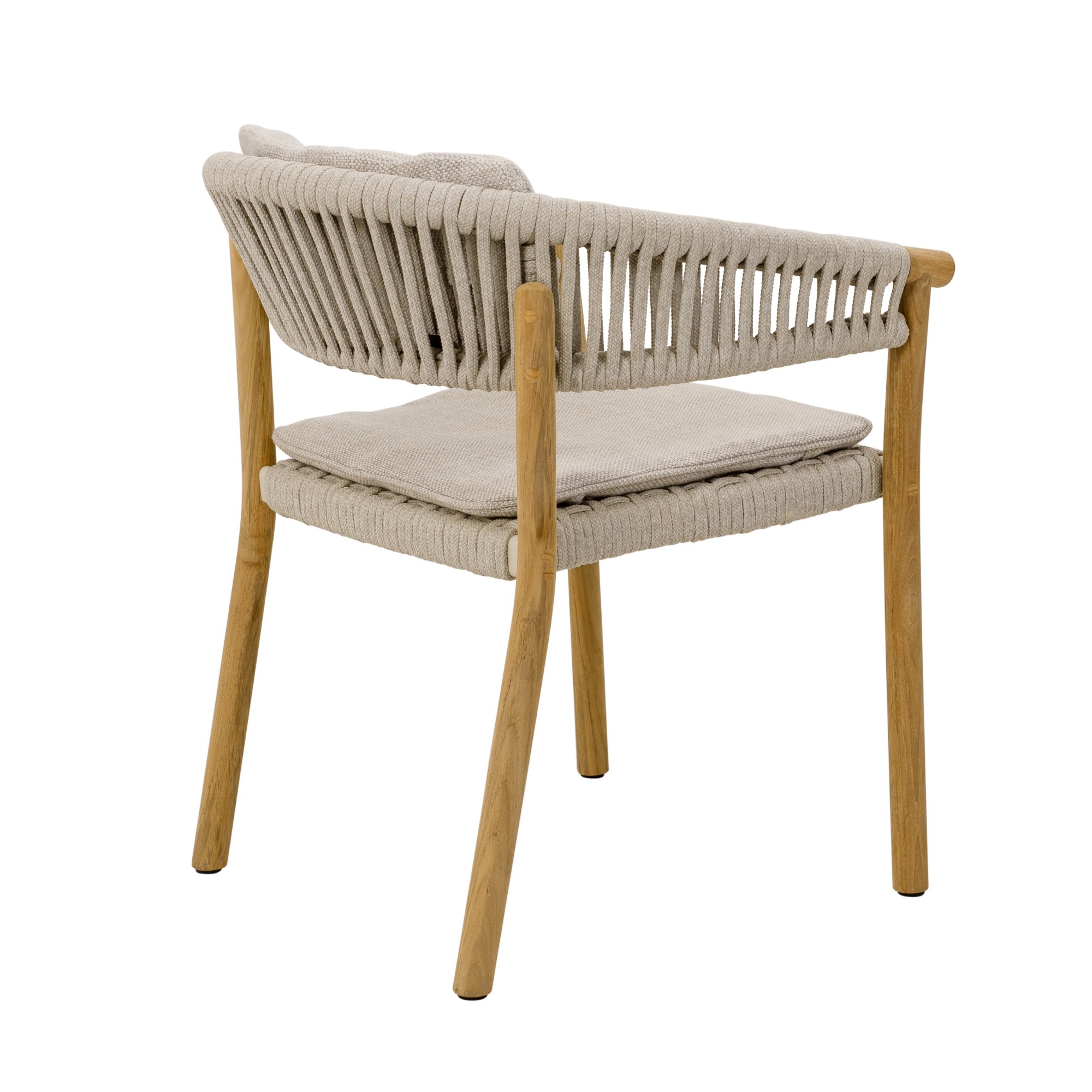Der Gartenstuhl MARCELLA DINING CHAIR von Traditional Teak mit gepolsterter Sitz- und Rückenfläche in der Ausführung Round Rope Linen