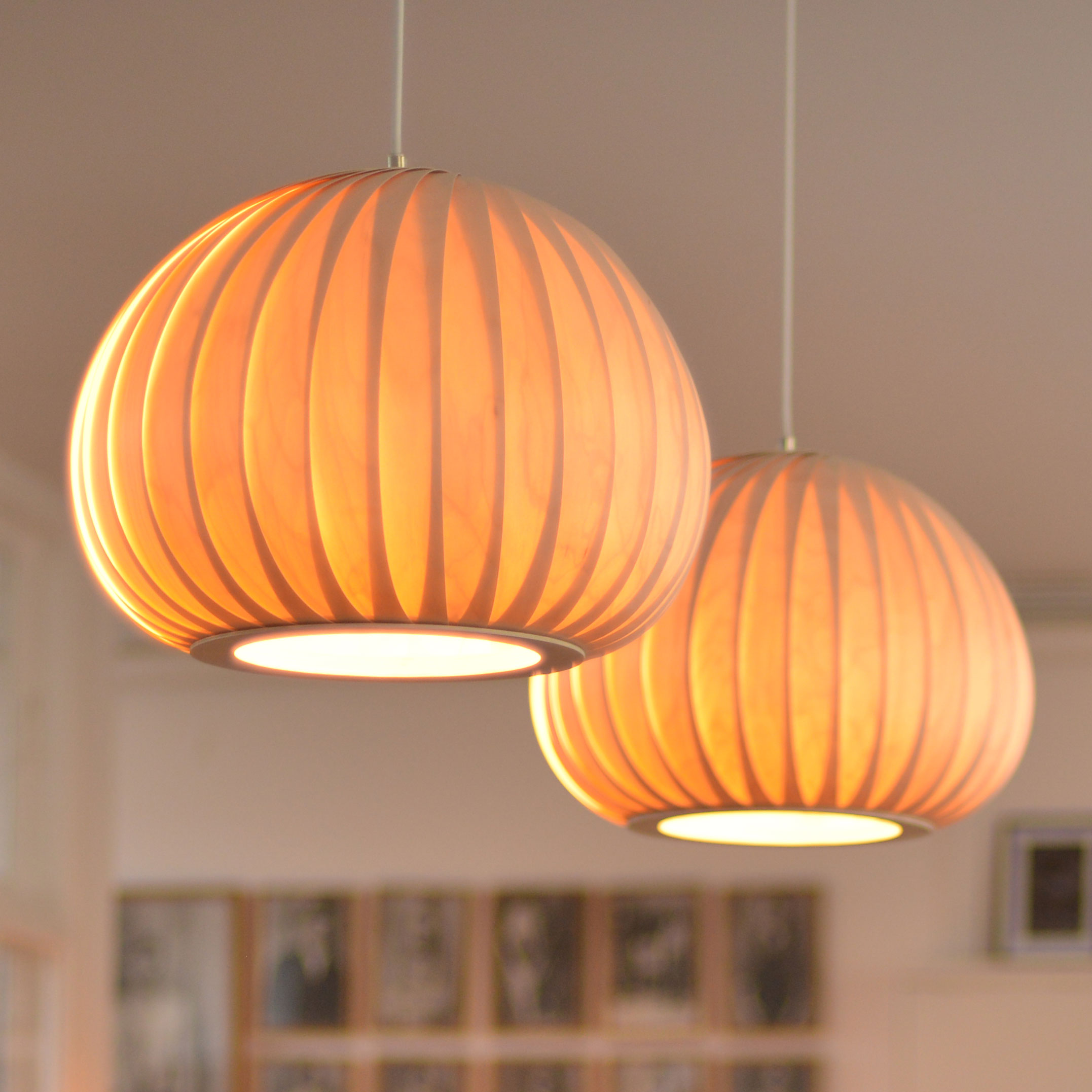 Die Lampe gibt es in drei verschiedenen Größen. Das Licht des Leuchtmittels wird durch das Material des Holzfurniers wesentlich wärmer ausgestrahlt.