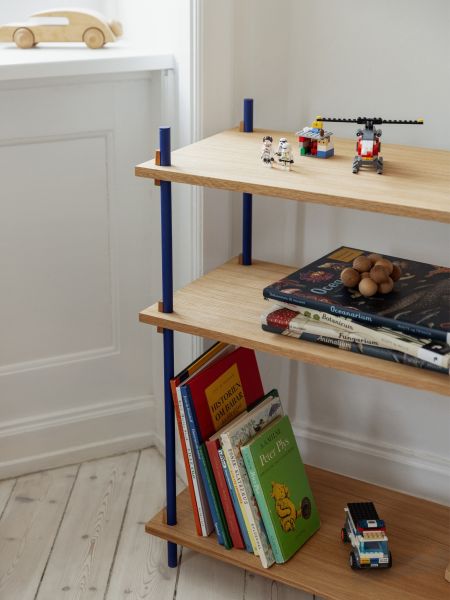 Zwischen dem kräftigen Blau des Metallgestells und dem natürlichen Eichenholzfurnier entsteht ein lebendiger Kontrast, der das SHELVING SYSTEM Von MOEBE zu einem echten Blickfang macht