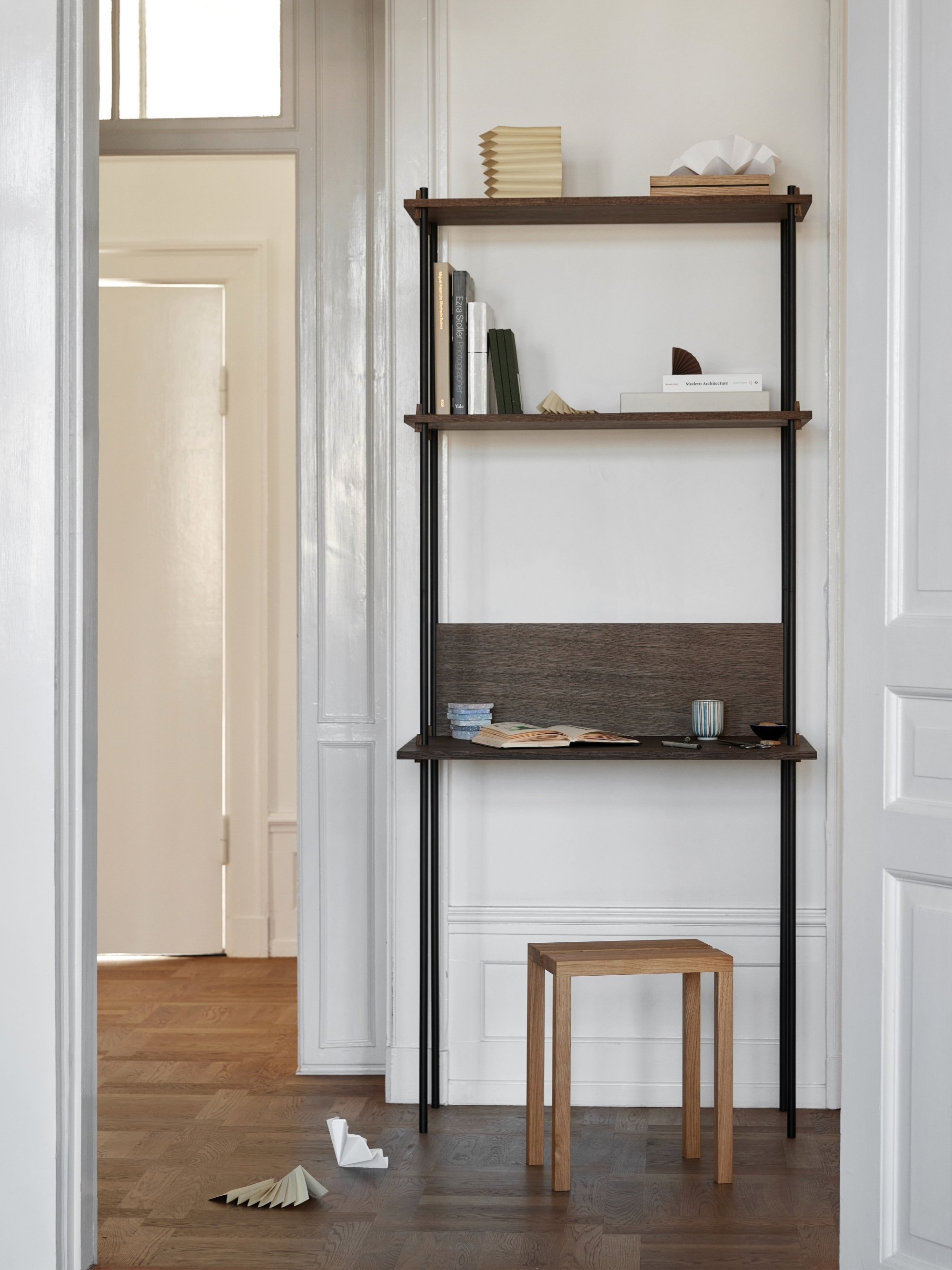 Der SHELVING SYSTEM WORKSPACE SINGLE von MOEBE wird mit zwei Regalböden und eine Schreibtischplatte geliefert - auf Anfrage kann das Regal mit Schreibtisch jederzeit erweitert werden