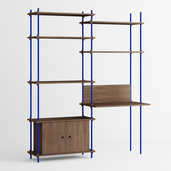 Regal mit Schreibtisch SHELVING SYSTEM WORKSPACE DOUBLE von MOEBE in Eiche geräuchert mit blauem Gestell
