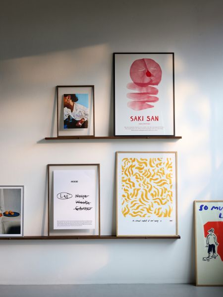Nahtlos lassen sich zwei oder mehr GALLERY SHELVES zu einer langen Bilderleiste kombinieren oder mehrere Ebenen für Kunstwerke mit verschiedenen Formaten und Größen zu schaffen. Ein Perfect Match mit der Bilderleiste sind die filigranen Bilderrahmen FRAME aus Holz oder die FRAME aus Alu von MOEBE.