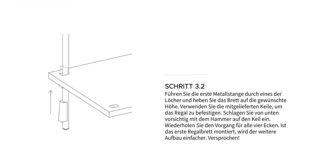 Der Aufbau des SHELVING SYSTEM ist einfach und Sie benötigen nicht mehr als einen Holz- oder Gummihammer, eine Wasserwaage (alternativ ein Lineal) und eine Bohrmaschine, insofern Sie sich dafür entscheiden, das SHELVING SYSTEM an der Wand zu sichern. Wir empfehlen es ausdrücklich.