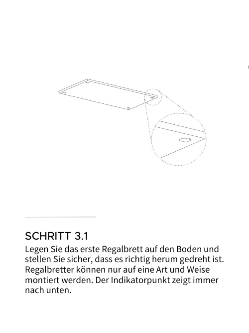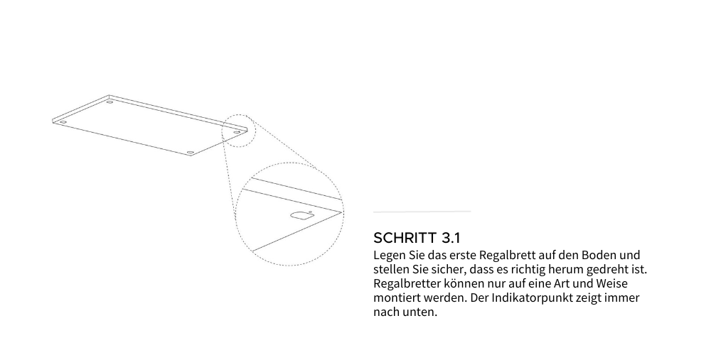 Alle anderen Elemente des SHELVING SYSTEM werden ähnlich montiert. Für einige stellt MOEBE außerdem zusätzliche Aufbauanleitungen zur Verfügung. Erlauben Sie uns dennoch ein paar zusätzliche Hinweise.