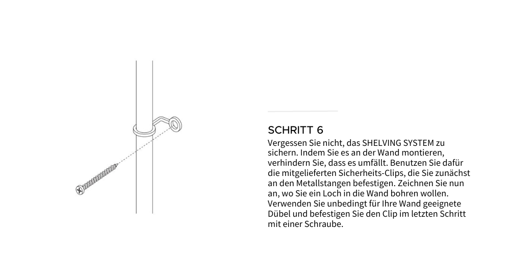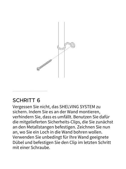 Jedem System liegen Endkappen END CAPS und ein Sicherheits-Clip SAFETY CLIP bei, die es Ihnen ermöglichen, das SHELVING SYSTEM an der Wand zu befestigen. Die Wandbefestigung ist kein Muss, wird aber von uns ganz klar empfohlen, um zu verhindern, dass das Regal kippt. Die Sicherheits-Clips werden an einem beliebigen Bein angebracht und in die Wand gebohrt. Misst die Regalkonstruktion in der Höhe mehr als 230 cm, sollten die Clips nicht ganz oben, sondern auf mittlerer Höhe angebracht werden.