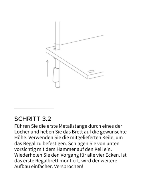 Im Folgenden sehen Sie eine Schritt-für-Schritt Aufbauanleitung in deutscher Sprache. Über folgenden Link laden Sie außerdem die originale Aufbauanleitung in englischer Sprache als PDF herunter: Assembly Instruction SHELVING SYSTEM.